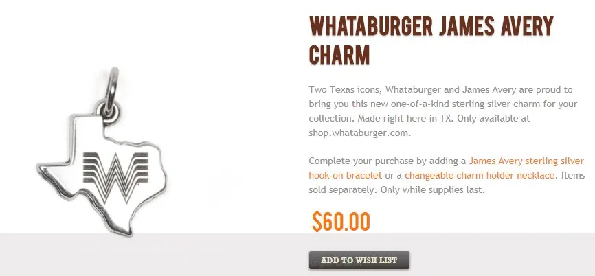 Whataburger and James Avery teamed up and you can buy jewelry to show your love in sterling silver Texas shaped charm with the Whataburger logo and made in Texas. READ MORE: HERE