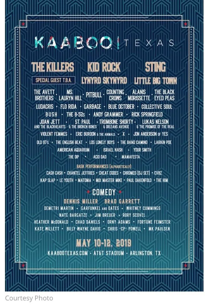Kaaboo Texas has announced its debut lineup, with The Killers, Kid Rock, Sting and Lynyrd Skynyrd heading up the Arlington, Texas, festival May 10-12. Other acts include Little Big Town, The Avett Brothers, Ms. Lauryn Hill, Pitbull and Counting Crows.