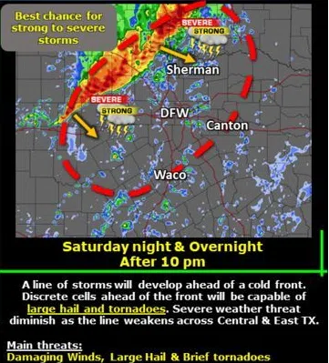 Looks like a good chance many of us will see some Severe Weather Saturday night into early Sunday. Here’s is the forecast from the NWS Fort Worth office. ” There will be chances of showers...