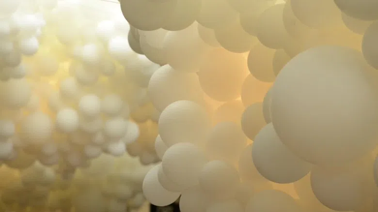 A massive art installation in Covent Garden, London made of more that 100.000 white balloons reflects the pulsing heartbeat of the area.