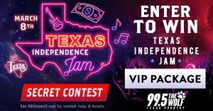 You’ve been selected for a Secret Contest! To thank you for listening to 99.5 The Wolf, we’ve got your chance to be a Texas Independence Jam VIP. Play our secret contest for your chance to win FOUR tickets to Texas Independence Jam ’26, a chance to meet THREE artists, a hotel night stay & $500! The more you listen, the more chances you have to WIN! There are 12 CHANCES to play every weekday.